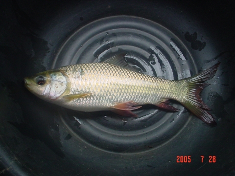 パ・イソック・テート コイ科 (Ciprinidae) 学名 : Labeo rohita Hamilton 英名 : Rohu 泰名 : ปลายี่สก、ปลายี่สกเทศ 日名 : 不詳 体長 : 200cm このあたりでは、ほとんど見かけない魚で、「パ・イソック」と呼んでいるが、中部タイあたりに産する在来の「パ・イソク」というのは、魚形は似ているのものの、縦じま模様がある別種の魚らしい。 最近になって、インドから導入された養殖魚らしい。 「鯉」以上に小さな中骨のある魚で、人気の方は、いまいち。 「ラープ」で生食されるか、 「酢さかな」に加工されることが多いようだ。 |